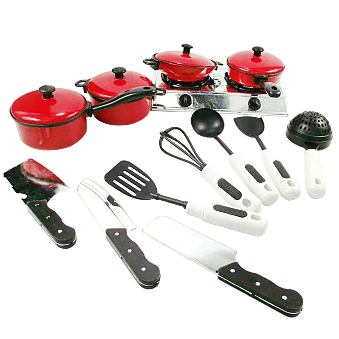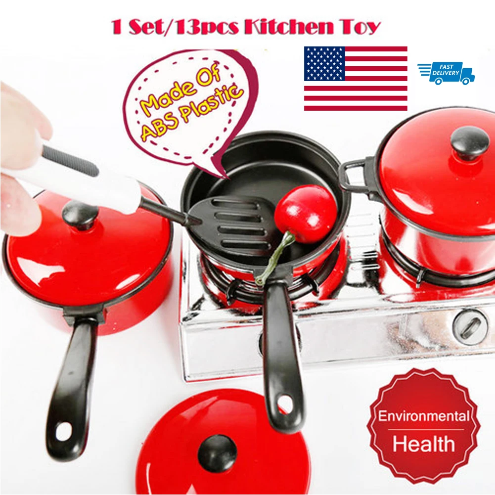 A set of plastic simulation kitchen cook ware for kids game playing includes 13 pcs